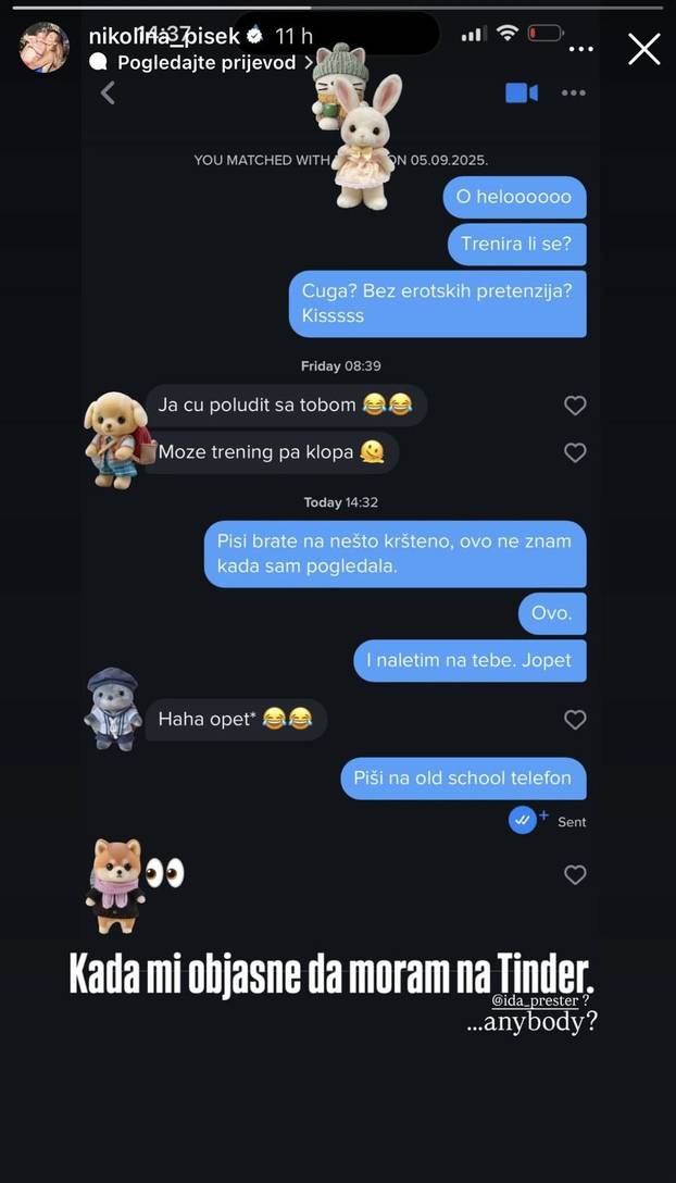 - Kada mi objasne da moram na Tinder - napisala je uz snimku zaslona jednog razgovora na toj stranici za upoznavanje novih ljudi. Označila je voditeljicu i pjevačicu Idu Prester, pa je svima bilo jasno tko stoji iza nagovaranja.