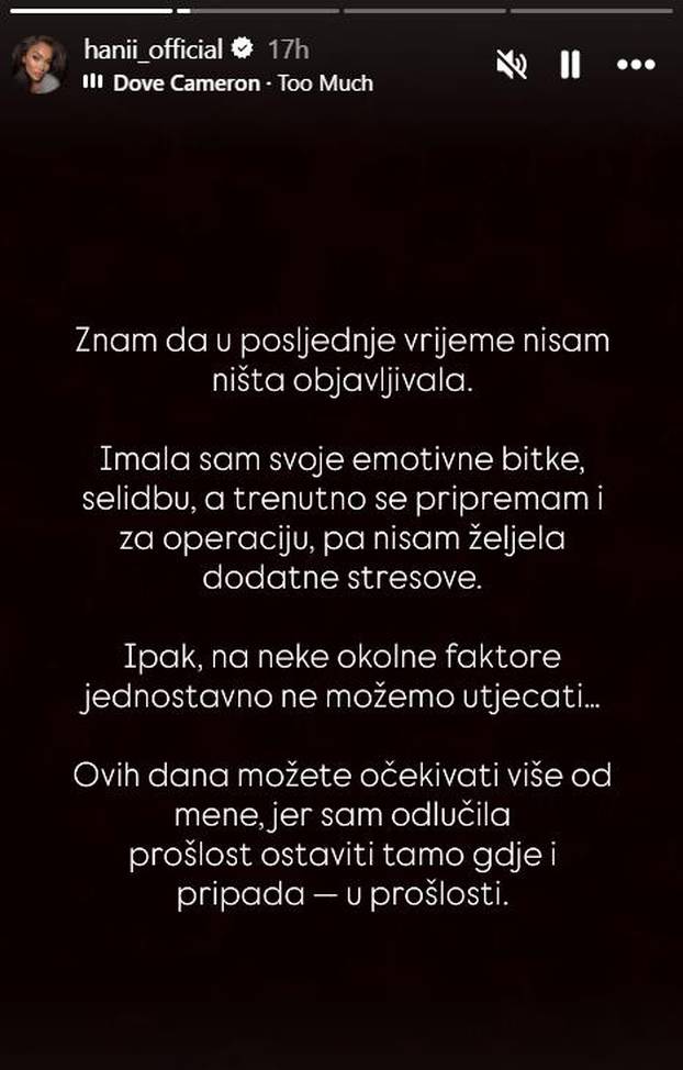 Budući da u posljednje vrijeme nije bila aktivna na društvenim mrežama, u idućem storyju Hana je otkrila i razlog tomu. Napisala je: 'Znam da u posljednje vrijeme nisam ništa objavljivala. Imala sam svoje emotivne bitke, selidbu, a trenutno se pripremam i za operaciju, pa nisam željela dodatne stresove. Ipak, na neke okolne faktore jednostavno ne možemo utjecati...' U nastavku objave obećala je kako fanovi idućih dana mogu očekivati više od nje te da će: 'prošlost ostaviti tamo gdje i pripada - u prošlosti'.