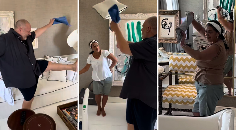Saša Šekoranja i Emina, kućna pomoćnica Lepe Brene, zapalili internet! Plešu, smiju se, čistku pretvorili u mali, ali zabavni party