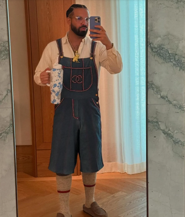Fotografije prikazuju 38-godišnjeg Drakea u neobičnoj odjeći, naizgled nadahnutoj tradicionalnim bavarskim kožnatim hlačama (lederhosenima). Na njima je nosio malu drvenu štipaljku ili na bavarskome 'glupperl', sa svojim imenom kao i malo srce na kojemu je pisalo "Too hot to Hendl" (Prevruće za podnijeti).