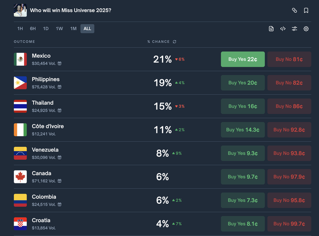 Hrvatska predstavnica Laura Gnjatović (23) trenutno je na 8. mjestu s četiri posto šanse za osvajanje titule Miss Universe, prema Polymarketu. Iako je nakon preliminarnog natjecanja došlo do blagog pada u njezinim izgledu za pobjedu, Laura i dalje drži visoko mjesto među favoritkinjama.