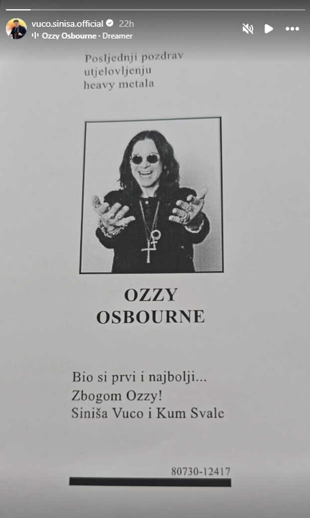 Siniša Vuco objavio je na društvenim mrežama osmrtnicu koju je platio za Ozzyja Osbournea, legendarnog glazbenika, osnivača Black Sabbatha, koji preminuo prije par dana u 77. godini.