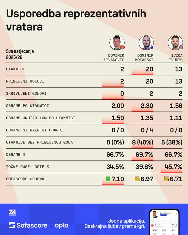 Evo i statističke usporedbe naših golmana, koju u slučaju Livakovića treba uzeti s dozom rezerve, s obzirom na mali uzorak utakmica.