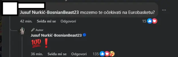 Naime, navijači su ga ispod jedne objave upitali hoće li se priključiti reprezentaciji za turnir, na što je Nurkić odgovorio: "100 posto".