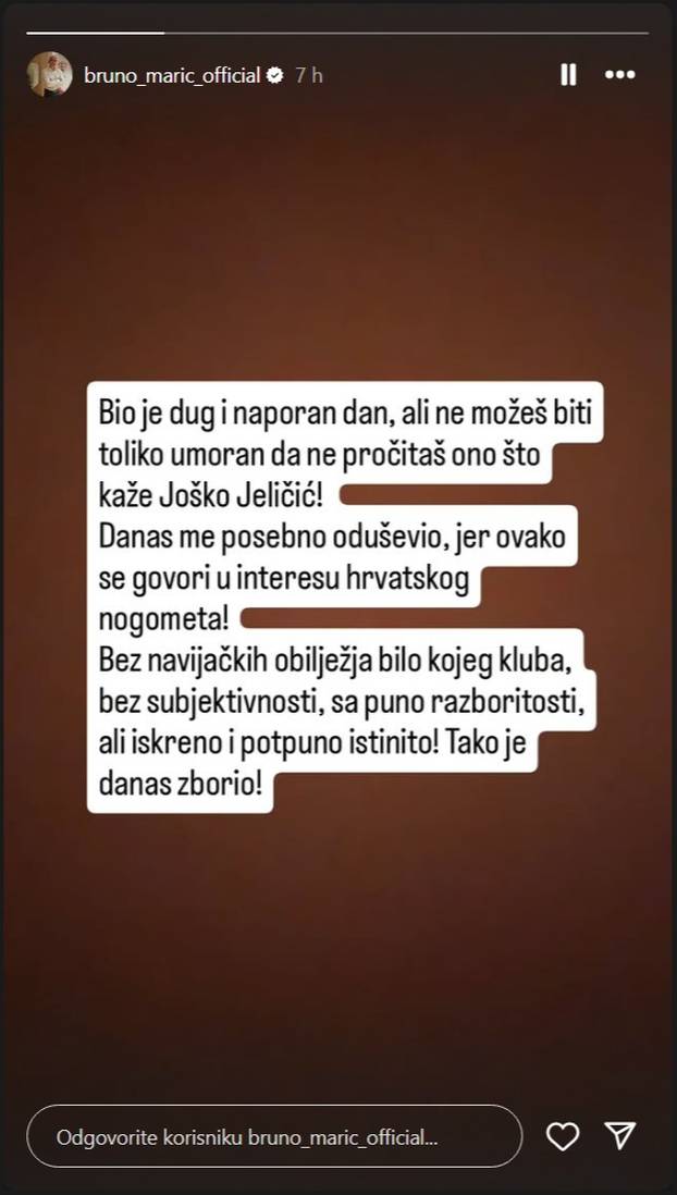 "Bio je dug i naporan dan, ali ne možeš biti toliko umoran da ne pročitaš ono što kaže Joško Jeličić! Danas me posebno oduševio, jer ovako se govori u interesu hrvatskog nogometa! Bez navijačkih obilježja bilo kojeg kluba, bez subjektivnosti, sa puno razboritosti, ali iskreno i potpuno istinito! Tako je danas zborio!", napisao je Marić na Instagramu.