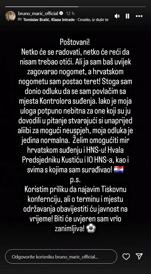 "Predsjednik Komisije nogometnih sudaca HNS-a Bruno Marić podnio je ostavku na dosadašnju dužnost. Dosadašnji predsjednik Komisije nogometnih sudaca HNS-a Bruno Marić podnio je ostavku na svoju dužnost te u razgovoru s predsjednikom Hrvatskog nogometnog saveza Marijanom Kustićem iznio osobne razloge zbog kojih je donio takvu odluku. Predsjednik Kustić izrazio je razumijevanje za iznesene razloge te je ostavku prihvatio, a Izvršni odbor usvojio."