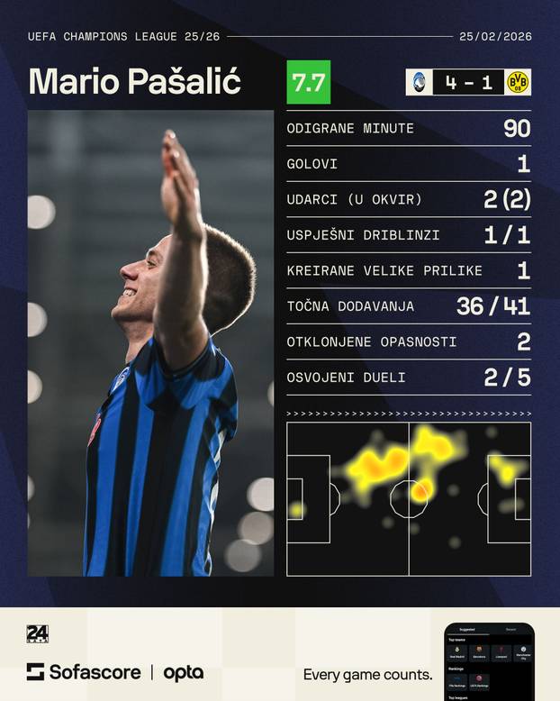 Naime, Borussia Dortmund suvereno je slavila u Njemačkoj 2-0 i činilo se da će susret u Italiji biti tek formalnost. Pašalić je nakon odlaska Ivana Jurića pomalo ispao iz početnog sastava, ali je u uzvratu ipak dobio priliku od prve minute i to je treneru Raffaelu Palladinu vratio na najbolji mogući način.