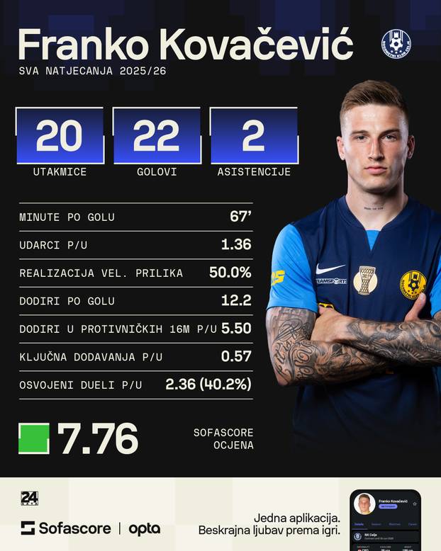 Pretpoziv Zlatka Dalića kruna je sezone iz snova za Franka Kovačevića. Bivši igrač Hajduka, koji je u karijeri promijenio niz klubova i liga, od Rudeša i Hoffenheima do Cipra i Južne Koreje, ovog se ljeta skrasio u Celju i doslovno eksplodirao. Njegove brojke su nevjerojatne: u 20 ovosezonskih utakmica u svim natjecanjima postigao je čak 22 gola, čime je drugi najubojitiji strijelac svijeta ove sezone, odmah iza Portorikanca Jorgea Rivere (26 golova u 13 utakmica), a ispred Harryja Kanea (20 golova).