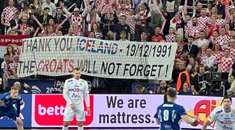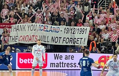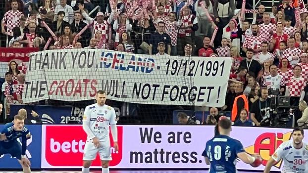 Hrvatska je pobijedila Island 32-26, a naše igrače došla je podržati puna Arena Zagreb. Skupina "Mi Hrvati" na tribinama je pokazala i poseban transparent zahvale Islanđanima