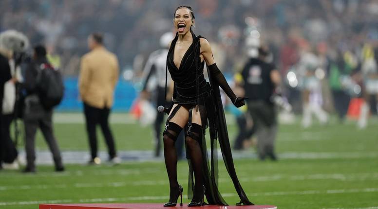 Karina Pasian, američka pjevačica s prebivalištem u Madridu, koja je uoči utakmice pjevala američku himnu, izašla je na teren u crnoj mini haljini s dubokim dekolteom, koju je upotpunila čarapama do bedara, podvezicama i dugim crnim rukavicama. Čim je NFL objavio snimku izvedbe na društvenoj mreži X, uslijedila je lavina negativnih komentara.
