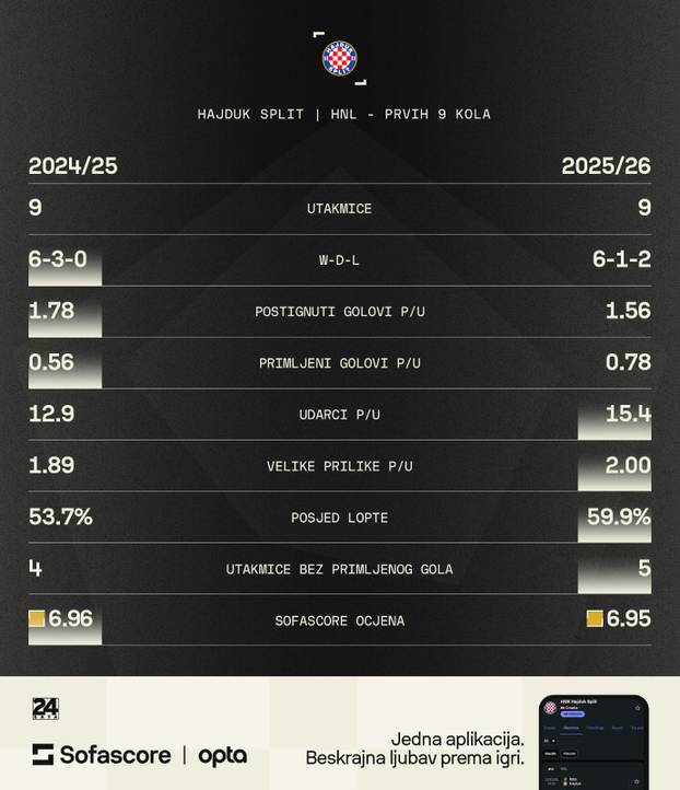 Dakako, devet utakmica nije velik uzorak i još treba pričekati na veće zaključke. Ono što može zabrinjavati Garciju jest samo 14 zabijenih golova u devet utakmica, a Hajduk je stvorio samo 18 velikih prilika, po čemu je tek četvrta momčad lige. Čak šest puta su igrači Hajduka pogađali prečku i u tom je segmentu samo prvak Hrvatske ispred (7), a po posjedu lopte je Hajduk prvi u ligi (u trenutku pisanja teksta) s prosjekom od 59,9 posto.