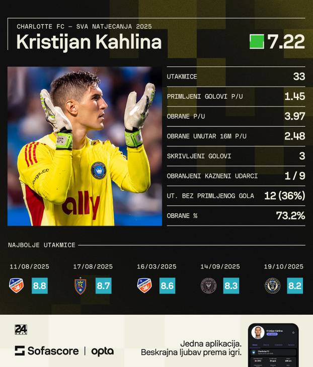 Od 2022. je u redovima Charlottea i sad je nezamislivo da momčad iz Sjeverne Karoline igra bez sigurnih ruku između vratnica. Kristijan Kahlina (33) i ove bi godine mogao odnijeti nagradu za najboljega golmana MLS-a, a play-off još nije ni počeo. Njegova je momčad ušla u nokaut fazu velikim dijelom zahvaljujući njemu, a tamo ih u dvomeču osmine finala očekuje New York City.