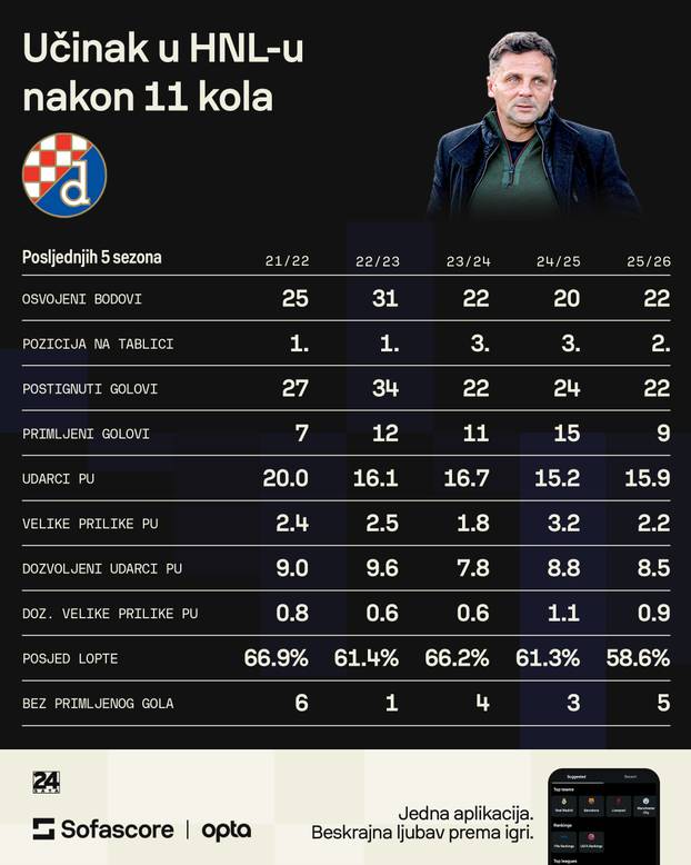 Prije četiri godine, kad je na klupi maksimirskog kluba bio Damir Krznar, Dinamo je nakon 11 kola imao 25 bodova i završio prvenstvo sa sedam bodova pred Hajdukom, potvrdivši naslov kolo prije kraja. Uvid u statistiku govori i da je Dinamo te sezone imao najveći posjed lopte u prvih 11 kola, gotovo dvije trećine vremena. Ove sezone je po tom kriteriju nikad slabiji s 58,6 posto.