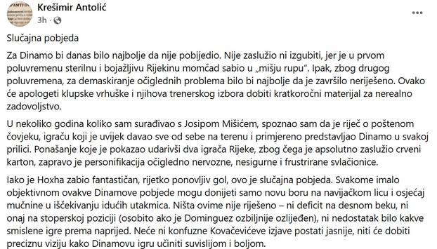 Ipak, Antolić ne propušta komentirati događanja u klubu u koji je dugo godina svaki dan dolazio na posao. Nakon derbija Dinama i Rijeke objavio je svoj komentar na Facebooku pa objavu ubrzo maknuo.