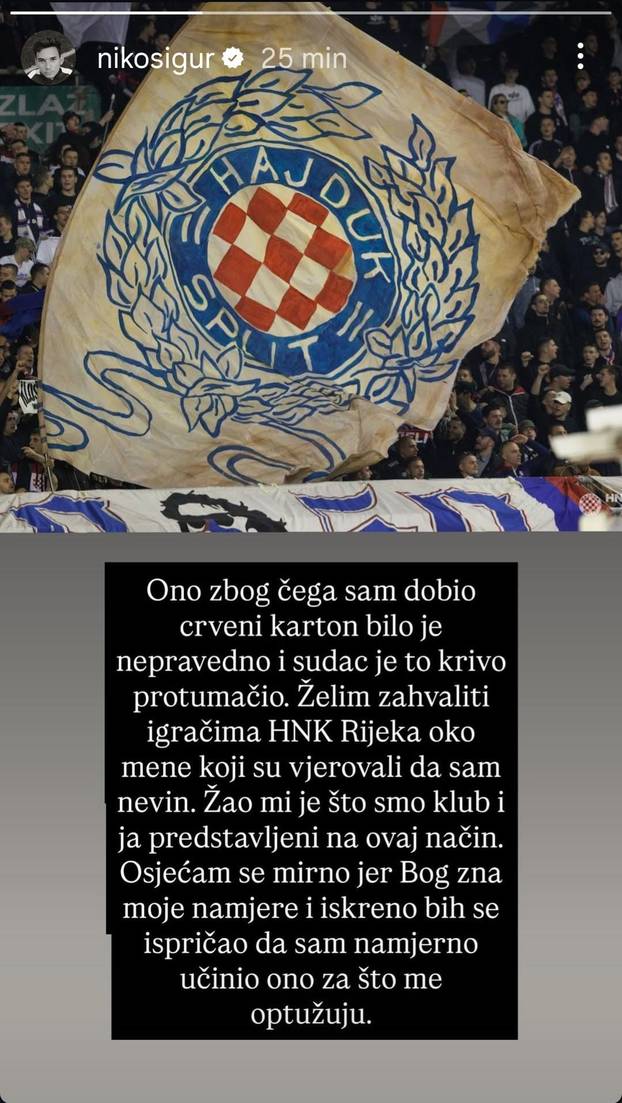 - Ono zbog čega sam dobio crveni karton bilo je nepravedno i sudac je to krivo protumačio. Želim zahvaliti igračima HNK Rijeka oko mene koji su vjerovali da sam nevin. Žao mi je što smo klub i ja predstavljeni na ovaj način. Osjećam se mirno jer Bog zna moje namjere i iskreno bih se ispričao da sam namjerno učinio ono za što me optužuju - napisao je Sigur.