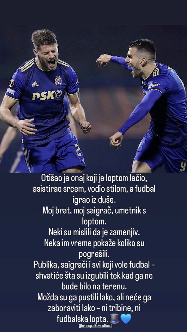 U ponedjeljak se Dinamo i službeno oprostio od Brune Petkovića (30) i Marka Pjace (30). Kako su 24sata ekskluzivno objavile dan ranije, Dinamo je raskinuo ugovore s dvojicom senatora, koji su tijekom ljetnog prijelaznog roka postali slobodni igrači i mogu samostalno potražiti nove angažmane. "Modri" su se od obojice oprostio emotivnim porukama, a posebno je odjeknula kratka zahvala Petkovića koji je ispod objave napisao samo: "Nema na čemu". Ispod su se nizali komentari bivših suigrača, a od Brune se sada oprostio i Komnen Andrić.