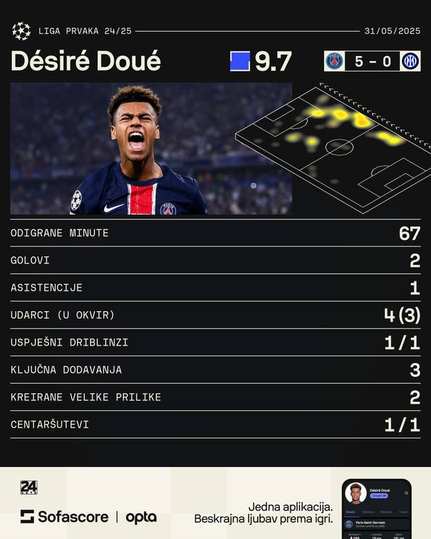 Paris Saint-Germain razmontirao je Inter u finalu Lige prvaka i s 5-0 osvojio prvi trofej u povijesti. Briljirao je mladi Désiré Doué (19) s dva gola i nekoliko sjajnih poteza.