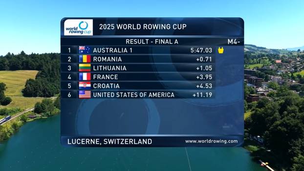 Posljednjih 500 metara bilo je iznimno uzbudljivo jer Rumunji su povećali tempo i podigli zaveslaje na sjajnih 50, ali ni to im nije bilo dovoljno za sustići Australce koji su izgradili dovoljnu prednost da izdrže do kraja i na koncu su osvojili zlato na Svjetskom kupu.