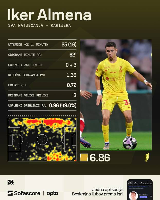 Već dugo se na Poljudu priča o još jednom potencijalnom transferu, a sada je procurilo i ime igrača kojeg Goran Vučević i Ivan Rakitić žele dovesti u Hajduk. Štoviše, već se neko vrijeme vode razgovori na tu temu i posao je, kako doznaju 24sata, pred zaključenjem. Riječ je o mladom krilnom napadaču saudijskog Al-Qadsiaha Ikeru Almeni (21). Španjolac je bio velika nada Girone, ali je prošlog ljeta, na iznenađenje mnogih, odlučio prihvatiti izdašnu ponudu saudijskog prvoligaša koji je za njega klubu iz La Lige platio pet milijuna eura.