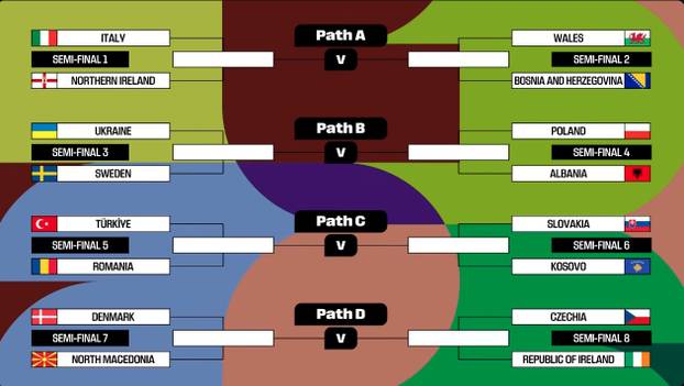 Danci su u zadnja dva kola kvalifikacija ispustili izravan plasman. U polufinalu dočekuju Sjevernu Makedoniju, reprezentaciju koja je stvorila jednu od najvećih senzacija u povijesti doigravanja izbacivši Italiju 2022. U drugom paru Češka dočekuje Republiku Irsku. Irci su u velikom naletu, osigurali su doigravanje pobjedom u zadnjim sekundama protiv Mađarske i vjeruju da mogu do kraja. Velika prednost za njih je što bi, u slučaju prolaska, bili domaćini finala u Dublinu, što im daje realne šanse čak i protiv Danske.