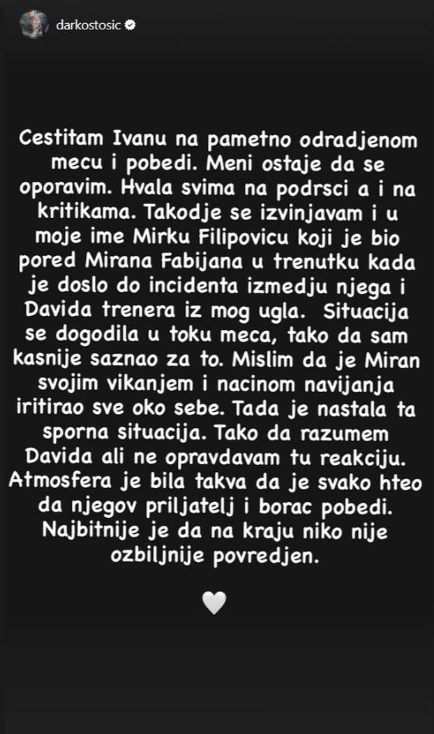 - U svoje ime ispričavam se Mirku Filipoviću, koji je bio pored Mirana Fabjana u trenutku kada je došlo do incidenta između njega i Davida, trenera iz mog tima. Situacija se dogodila tijekom meča, pa sam tek kasnije saznao za to. Miran je svojim vikom i načinom navijanja iritirao sve oko sebe. Tada je nastala ta sporna situacija. Razumijem Davida, ali ne opravdavam njegovu reakciju. Najvažnije je da na kraju nitko nije bio ozbiljnije ozlijeđen.