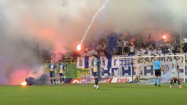 Tek tada stoper Rijeke shvatio je što se dogodilo i potrčao kako bi se udaljio od baklji koje su nastavile padati na travnjak. S druge strane, ni domaća navijačka skupina nije ostala dužna – i oni su odgovorili svojom koreografijom, koja se većinom sastojala od dimnih bombi zelene i sive boje.