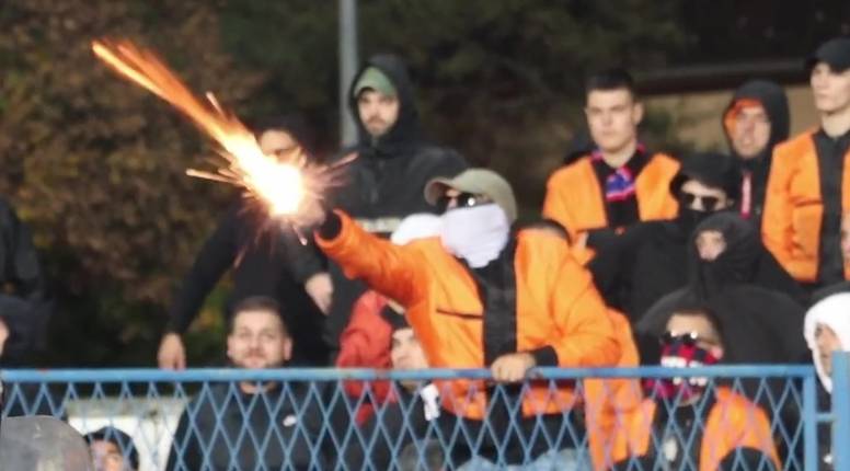 Šokantna snimka portala Nogometne vijesti zabilježila je maskiranog huligana kako se penje na ogradu i hladnokrvno ispaljuje signalnu raketu prema masi ljudi. Prema službenom policijskom izvješću, četiri rakete pale su izravno na prostor za gledatelje. Pravim čudom nitko nije teže ozlijeđen, a ostatak stadiona zgroženo je zvižducima i pogrdnim skandiranjem ispratio divljaštvo gostujućih navijača. Utakmica je, naravno, bila prekinuta na nekoliko minuta dok se situacija nije barem prividno smirila.