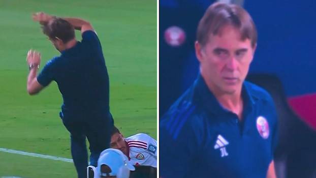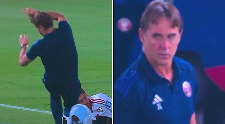 Izbornik Katara, Julen Lopetegui, potpuno nenamjerno završio je na tlu nakon što ga je lopta snažno pogodila ravno u glavu.